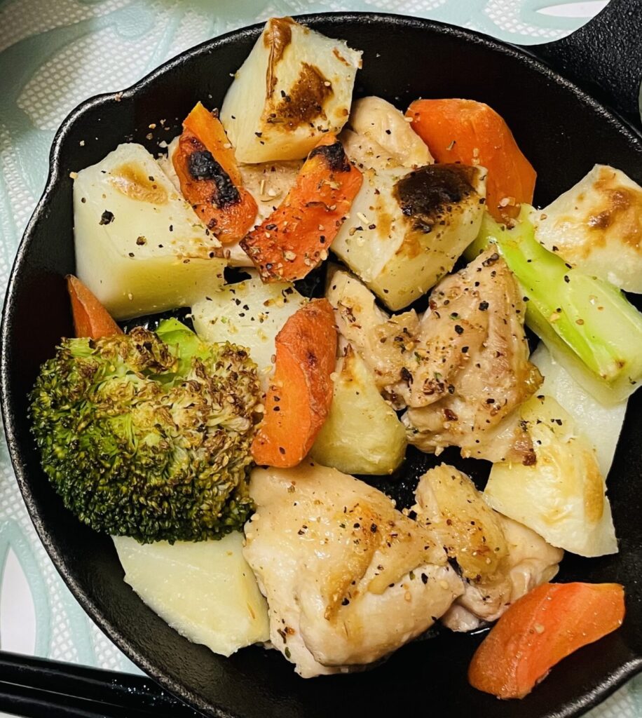- Arrange all the ingredients in a heat-safe dish (like a skillet or gratin dish). Season with chicken stock powder and salt.Use a toaster oven or a grill to cook until everything is done and the surface is nicely browned.